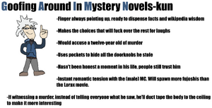 GAIMN-kun is the embodiment of Goofing Around in Mystery Novels. While his design is most closely reminiscent of Sai from The Sekimeiya: Spun Glass, he is based on almost every mystery VN Joe has streamed. The original artist is noleeresto.